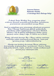 Komendant Główny Policji gen. insp. Marek Boroń w imieniu własnym oraz kierownictwa polskiej Policji zwraca się do policjantów, policjantek, pracowników cywilnych, emerytów i rencistów policyjnych oraz przedstawicieli związków zawodowych oraz organizacji pozarządowych przekazując życzenia z okazji Świąt Wielkanocnych.