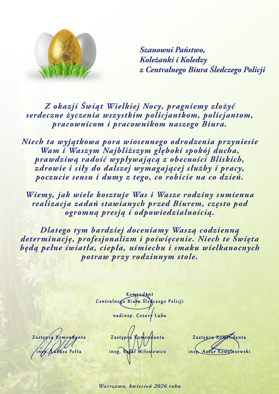 Komendant Centralnego Biura Śledczego Policji nadinsp. Cezary Luba wraz z Zastępcami Komendanta CBŚP insp. Łukaszem Fołtą, insp. Arturem Kowalczewskim i insp. Rafałem Miłosiewiczem składają życzenia z okazji Świąt Wielkiej Nocy.