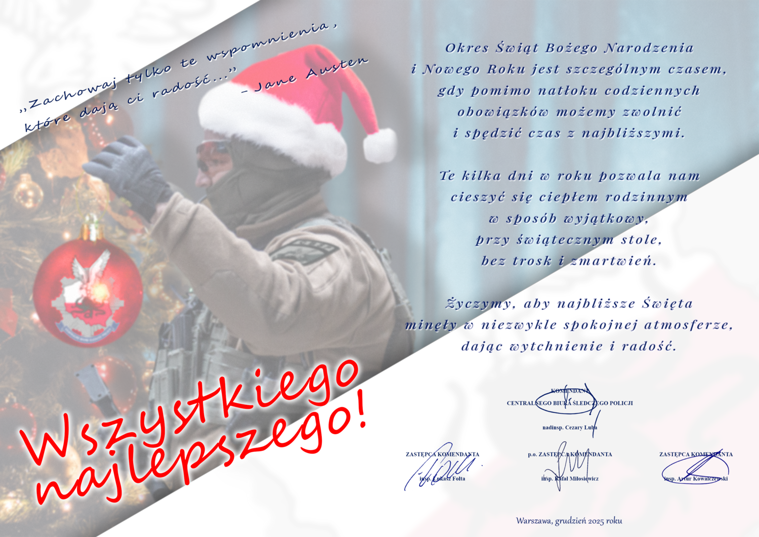 Komendant Centralnego Biura Śledczego Policji nadinsp. Cezary Luba wraz z Zastępcami Komendanta CBŚP insp. Łukaszem Fołtą, insp. Arturem Kowalczewskim i insp. Rafałem Miłosiewiczem składają życzenia z okazji Świąt Bożego Narodzenia i Nowego Roku.