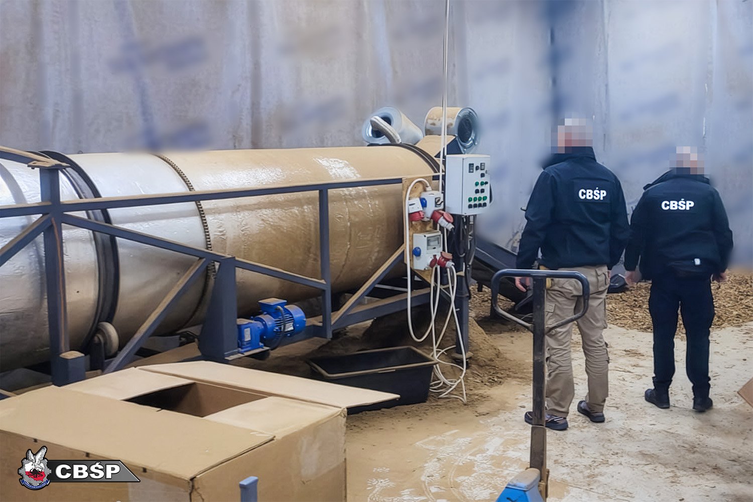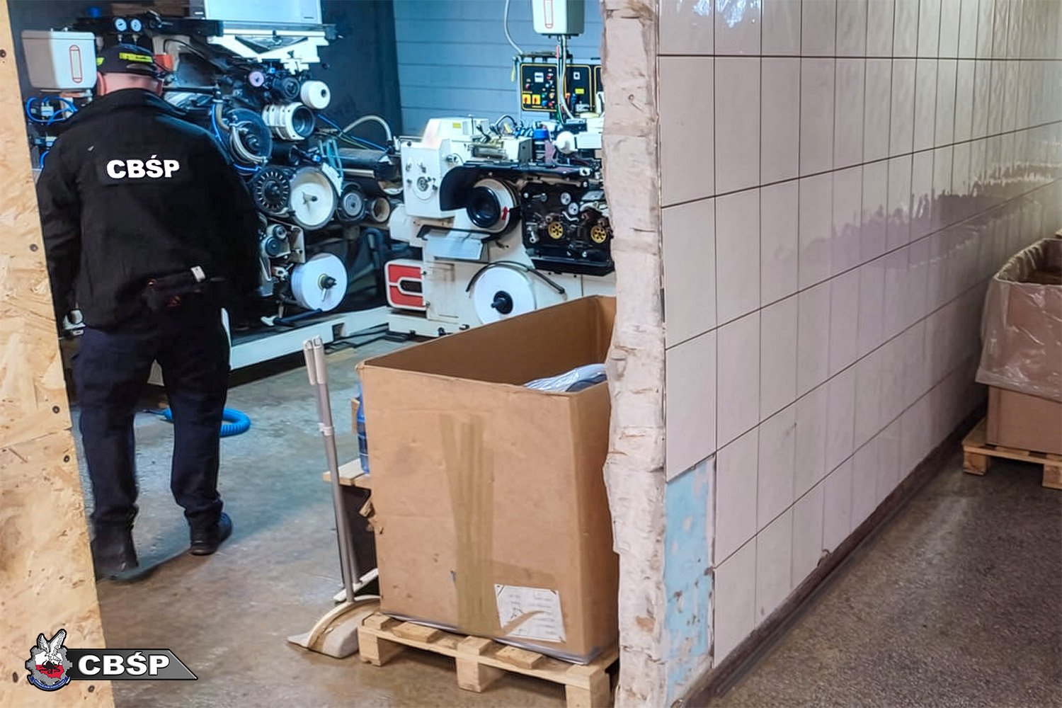 W trakcie realizacji sprawy na terenie województwa kujawsko-pomorskiego przeszukano posesję, na której znajdował się budynek byłej ubojni drobiu oraz przyległe zabudowania gospodarcze. W ich wnętrzu ujawniono profesjonalnie przygotowaną linię do przemysłowej produkcji papierosów.