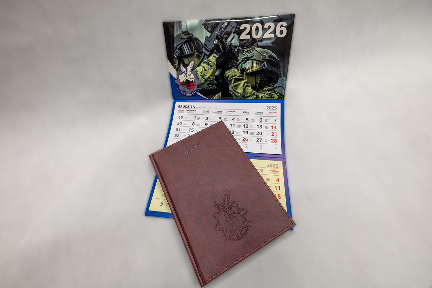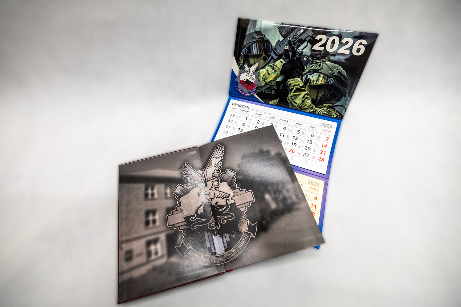 Komplet kalendarzy zawiera trójdzielny kalendarz ścienny z logiem CBŚP oraz zdjęciem policjantów CBŚP z zespołu specjalnego wykonanym na papierze błyszczącym, a także książkowy kalendarz z dziennym terminarzem, wewnątrz którego znajdują się zdjęcia z policjantami CBŚP na papierze błyszczącym.