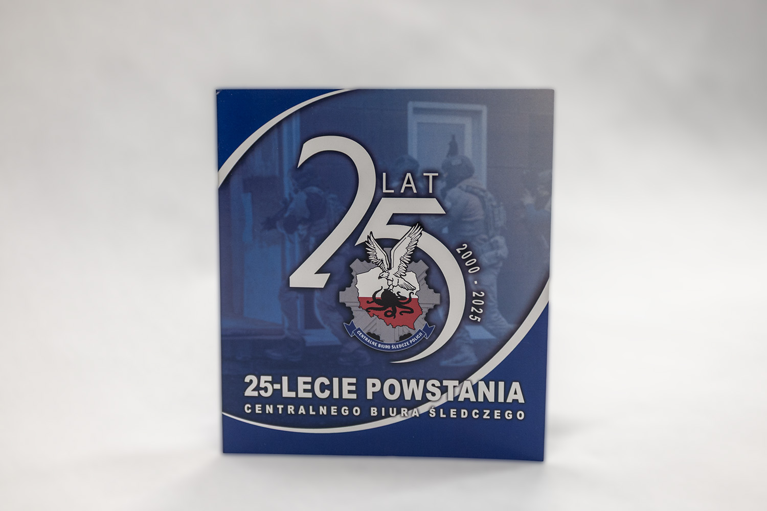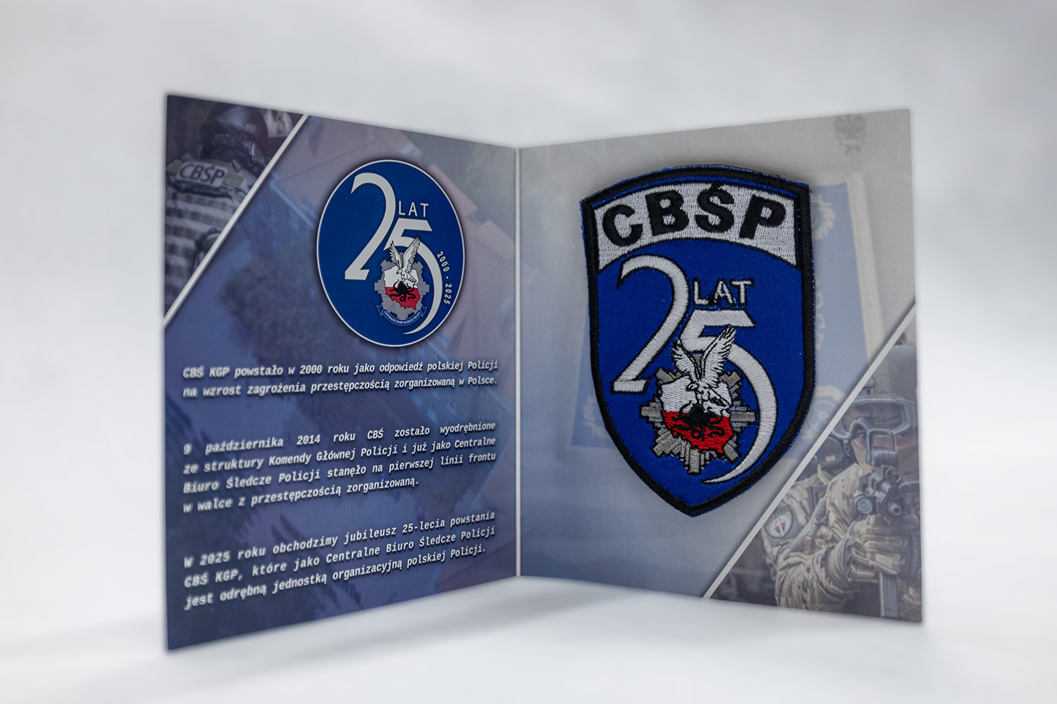 Okolicznościowa naszywka wytworzona z okazji 25 lat CBŚ wraz z folderem z połyskującego papieru sztywnego. Naszywka przedstawia logo 25 lat CBŚ oraz napis CBŚP. Na folderze są zamieszczone elementy graficzne oraz zdjęcia z policjantami CBŚP.