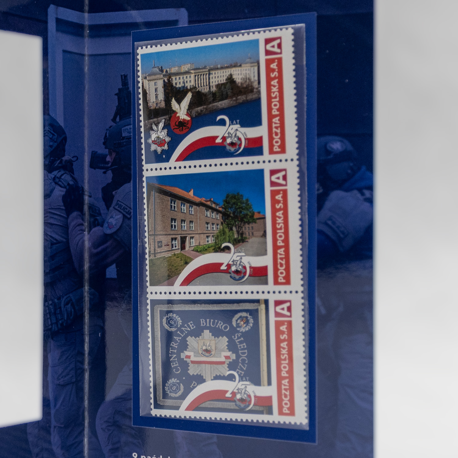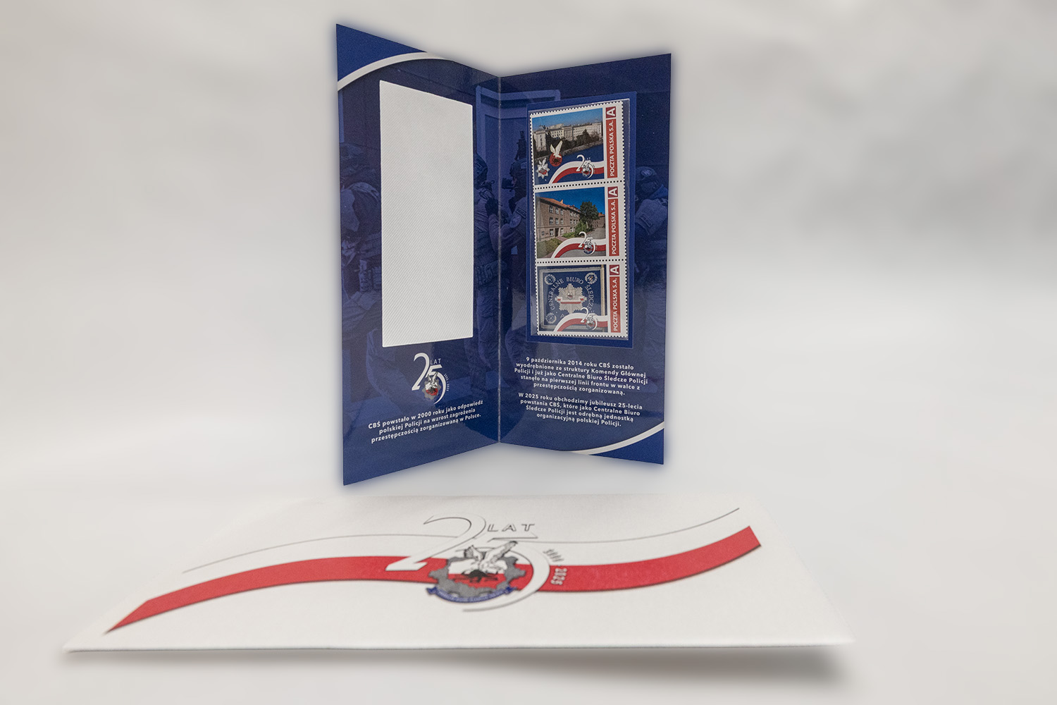 Pamiątkowe znaczki pocztowe wyprodukowane przez Pocztę Polską, wytworzone z okazji 25 lat CBŚ wraz z okładką z błyszczącego papieru sztywnego. Na znaczkach są zdjęcia budynku Komendy Głównej Policji, obecnej siedziby CBŚP, a także sztandaru CBŚP. Na okładce są naniesione elementy graficzne oraz zdjęcia z policjantami CBŚP.