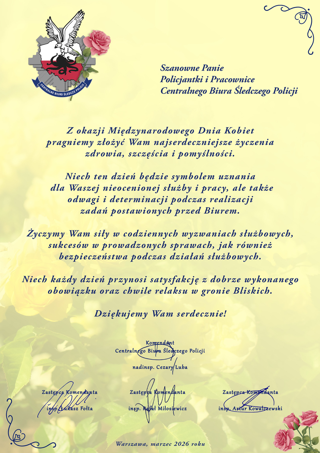 Z okazji Międzynarodowego Dnia Kobiet, Komendant Centralnego Biura Śledczego Policji nadinsp. Cezary Luba wraz z Zastępcami Komendanta CBŚP insp. Łukaszem Fołtą, insp. Arturem Kowalczewskim i insp. Rafałem Miłosiewiczem, dziękują wszystkim Policjantkom i Pracownicom Biura za codzienną służbę i pracę, życząc zdrowia, szczęścia i pomyślności.