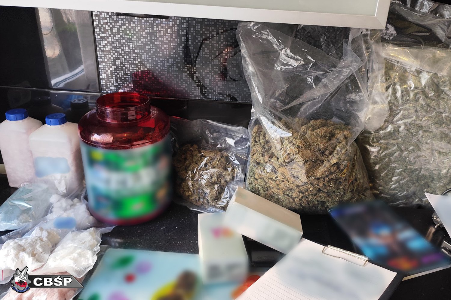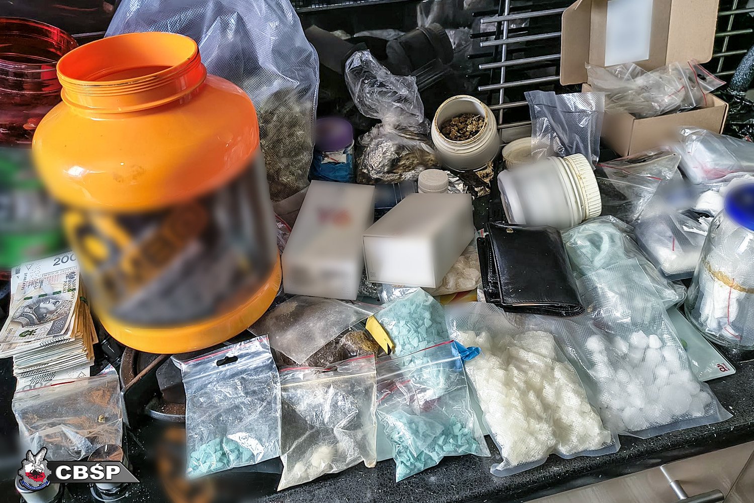 Podczas przeszukania funkcjonariusze ujawnili również znaczne ilości środków odurzających i substancji psychotropowych, w tym blisko 3 kilogramy marihuany, ponad 1900 tabletek MDMA, a także mniejsze ilości mefedronu, kokainy, amfetaminy oraz haszyszu.