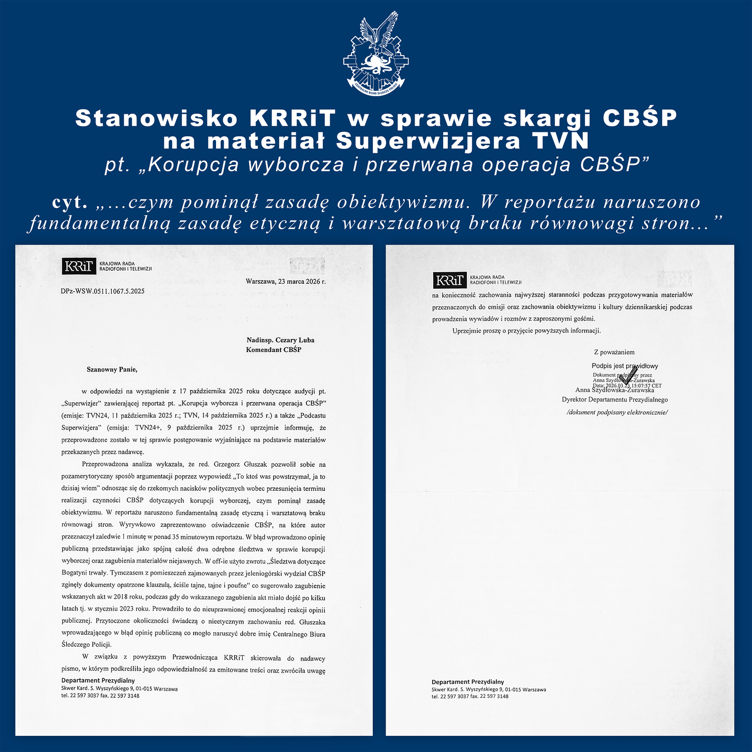Stanowisko KRRiT w sprawie skargi CBŚP na materiał Superwizjera TVN pt. „Korupcja wyborcza i przerwana operacja CBŚP”